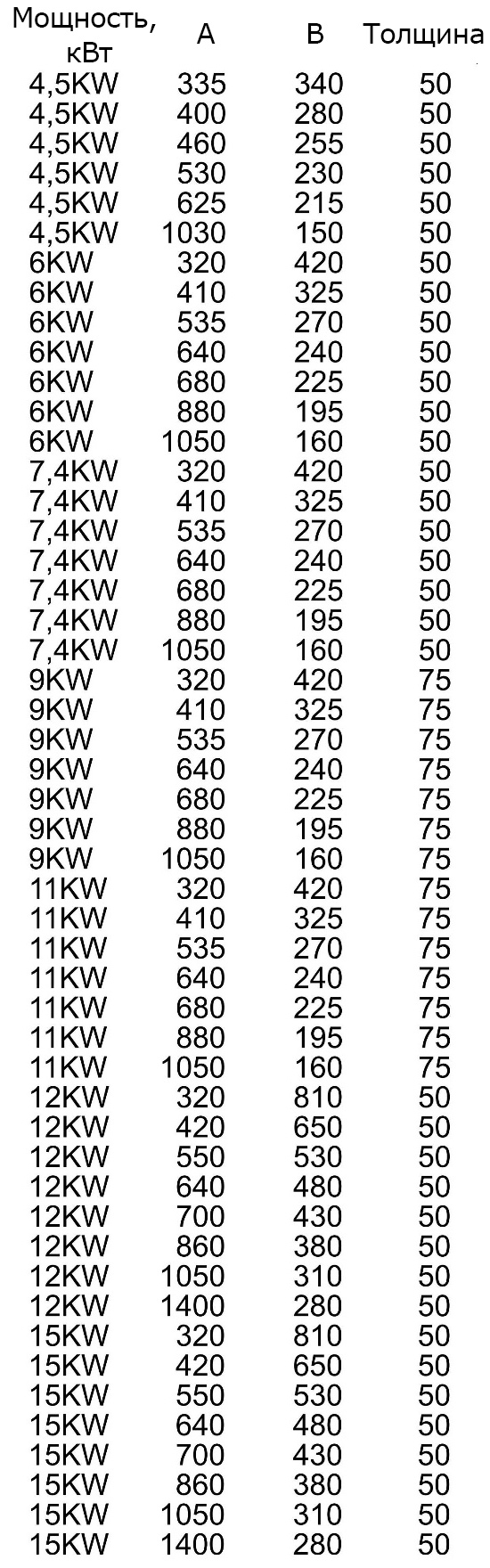 | Мощность, кВт | А | В | Толщина |